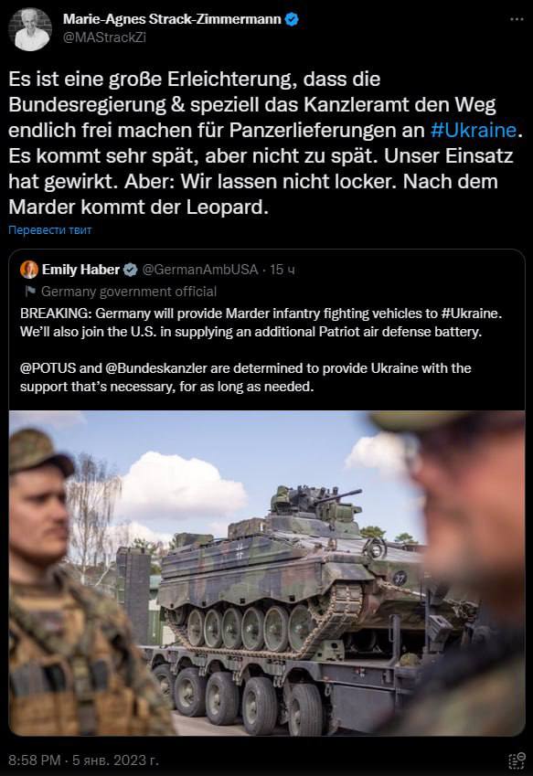 13.00 Председатель оборонного комитета Бундестага Агнес Штрак-Циммерманн приветствовала решение федерального правительства Германии поставить Украине бронетранспортеры Marder и предположила, что следующей поставкой станут танки Leopard.