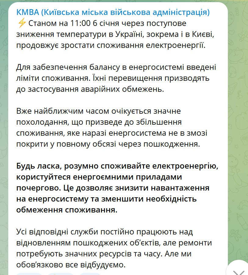 По данным городской военной администрации, сейчас в столице растет потребление электричества, поэтому введены лимиты потребления. Их превышение приведет к применению аварийных отключений.