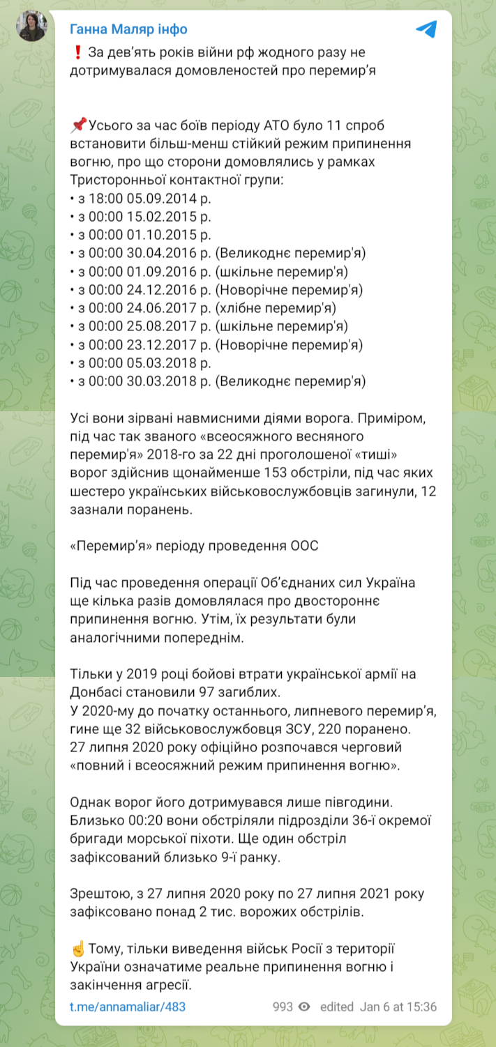Маляр пишет, что все попытки были сорваны умышленными действиями врага. К примеру, во время так называемого "всеобъемлющего весеннего перемирия" 2018 года за 22 дня объявленной "тишины" враг совершил по меньшей мере 153 обстрела, во время которых шесть украинских военнослужащих погибли, 12 получили ранения.