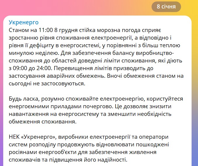 В воскресенье, 8 января, в Украине возможны аварийные отключения электроэнергии.