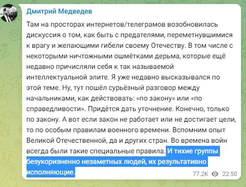"Возобновилась дискуссия о том, как быть с предателями, переметнувшимися к врагу и желающими гибели своему Отечеству. Я уже недавно высказывался по этой теме. Ну, тут пошёл сурьёзный разговор между начальниками, как действовать: "по закону" или "по справедливости". Придётся дать уточнение. Конечно, только по закону. А вот если закон не работает или не достигает цели, то по особым правилам военного времени. Вспомним опыт Великой Отечественной, да и других стран. Во времена войн всегда были такие специальные правила. И тихие группы безукоризненно незаметных людей, их результативно исполняющие", - написал Медведев.