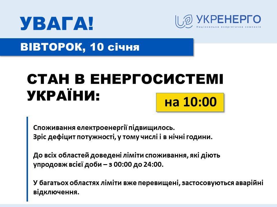 По состоянию на утро вторника, 10 января, потребление электроэнергии в Украине увеличилось из-за низкой температуры, усиленной сильным ветром в большинстве регионов. Также растет потребление промышленностью и бизнесом, в том числе и ночью. В связи с этим во многих областях вводятся аварийные отключения электроэнергии.