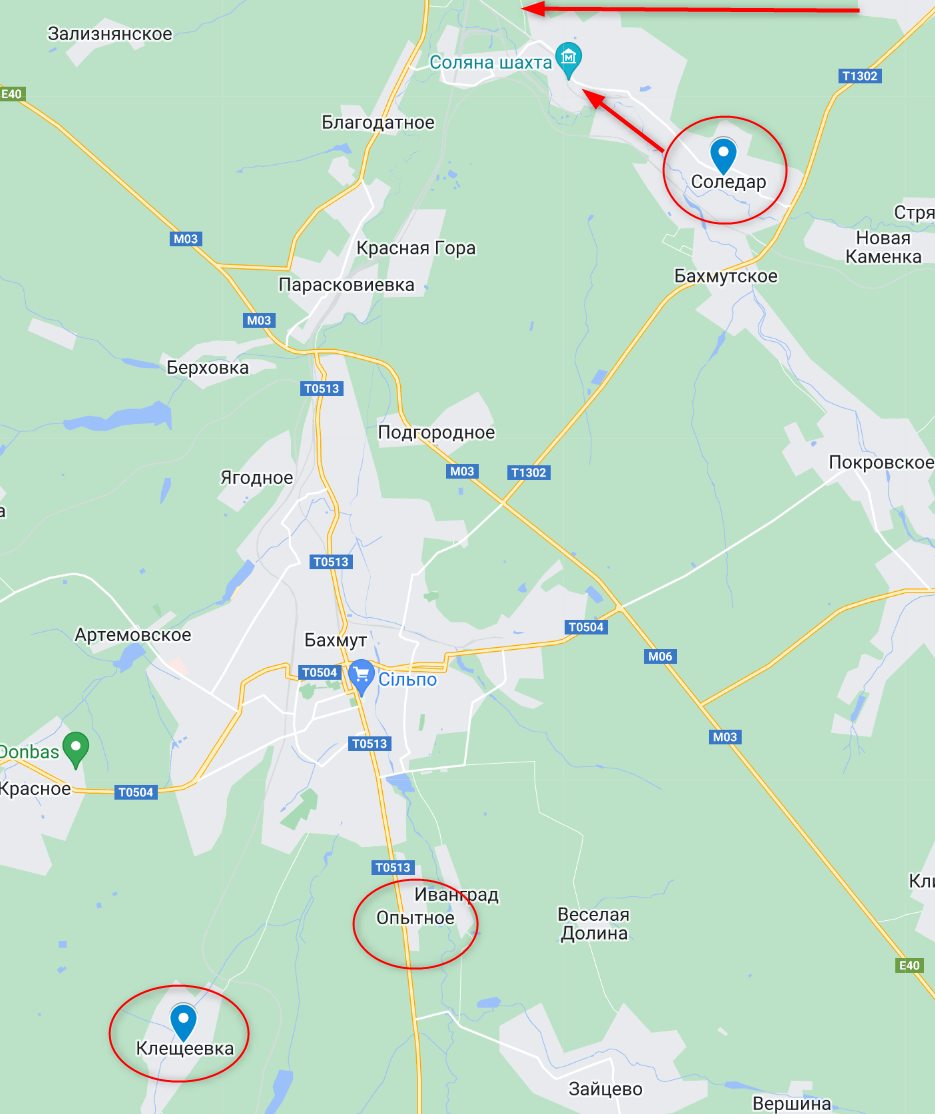 При этом битва за Соледар является частью более широкого маневра российских войск по окружению Бахмута. Если им удастся захватить Соледар, то они перережут дорогу в Бахмут из Северска. И это же упростит им задачу продвижения к северным окраинам города, чтобы перерезать и дорогу из Славянска (в районе сел Парасковиевка, Красная гора и Подгородное, к которым бои также уже приближаются).