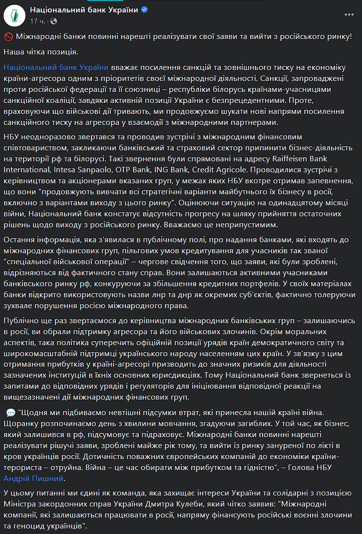 Нацбанк сообщает, что неоднократно ранее обращался с требованиями прекратить бизнес-деятельность в России и Беларуси к Raiffeisen Bank International, Intesa Sanpaolo, OTP Bank, ING Bank, Credit Agricole.