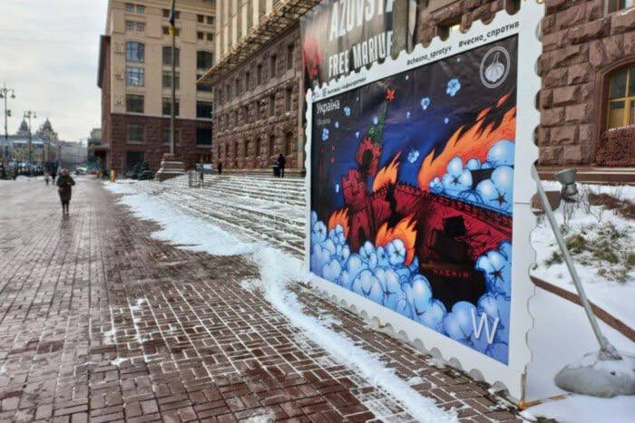 В Киеве у здания мэрии появилась марка-фотозона, на которой изображен горящий Кремль