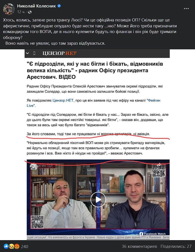 Так, военнослужащий Николай Колесник пишет, что Арестович "даже не представляет что там происходит".