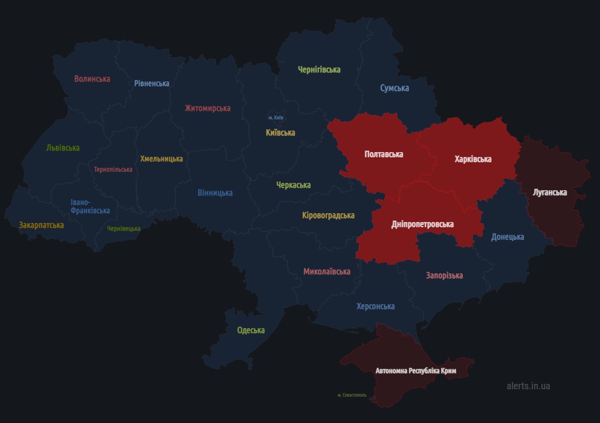 12.40 Воздушная тревога объявлена в Харьковской области. (В Луганской области и Крыму тревога действует постоянно).