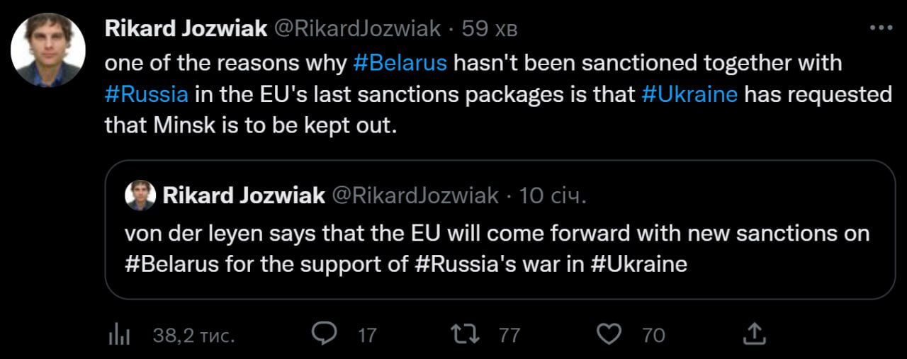 "Одна из причин, почему Беларусь не была подвергнута санкциям вместе с Россией в последних санкционных пакетах ЕС, является то, что Украина попросила не включать в них Минск", - написал он в Twitter.