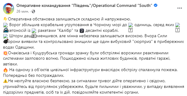 "Враг увеличил корабельную группировку в Черном море до 7️ единиц, среди которых 1️ ракетоноситель с 8️ ракетами "Калибр" и 2️ десантных корабля", - говорится в сообщении.