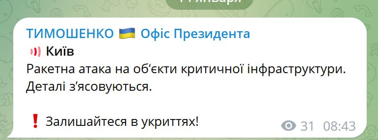 А замглавы ОП Кирилл Тимошенко сообщил, что в Киеве - ракетная атака на объекты критической инфраструктуры.
