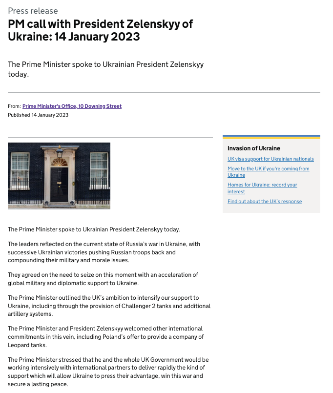"Премьер-министр обрисовал стремление Соединенного Королевства усилить нашу поддержку Украины, в том числе путем предоставления танков Challenger 2 и дополнительных артиллерийских систем", - говорится в сообщении.