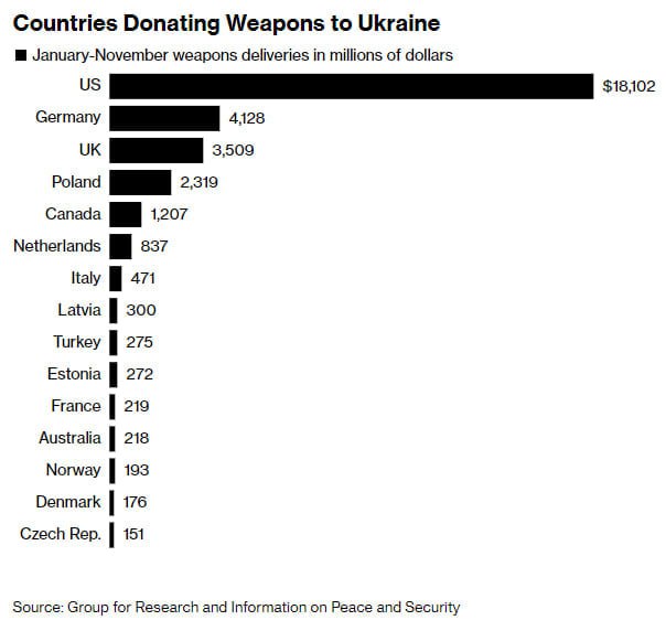 Bloomberg подсчитал, сколько и какого оружия передали Украине союзники с начала вторжения РФ. Инфографика