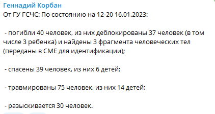 "По состоянию на 12:20 16 января погибли 40 человек, из них деблокированы 37 человек (в том числе 3 ребенка) и найдены 3 фрагмента человеческих тел (переданы в СМЕ для идентификации); спасены 39 человек, из них 6 детей; травмированы 75 человек, из них 14 детей; разыскивается 30 человек", - написал Корбан.