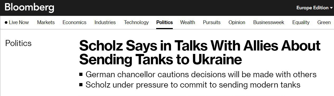 ​​Канцлер Германии Олаф Шольц ведет переговоры с союзниками о возможных поставках тяжелых танков в Украину, но предупредил, что любые объявления должны быть согласованы с другими.