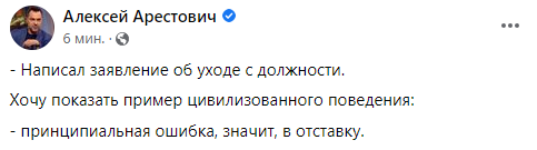"Написал заявление об уходе с должности. Хочу показать пример цивилизованного поведения: принципиальная ошибка, значит, в отставку", - объяснил он свои действия.