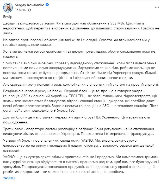 "У Киева сегодня было ограничение в 952 МВт. Этих лимитов недостаточно, чтобы перейти от экстренных отключений к плановым, стабилизационным. Графики бездействуют. На завтра прогнозируемые ограничения такие же, как сегодня. Сказать, удержимся ли мы в графиках завтра, пока сложно", – написал он.