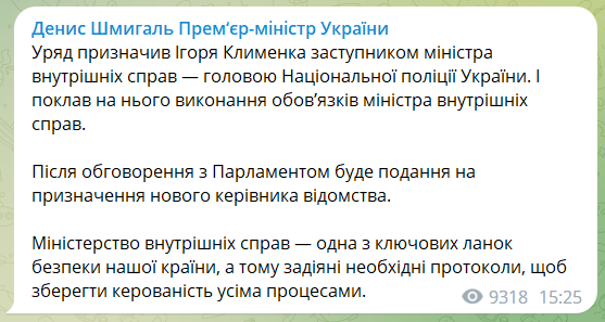 "После обсуждения с парламентом будет представлено назначение нового руководителя ведомства. Министерство внутренних дел — одно из ключевых звеньев безопасности нашей страны, поэтому задействованы необходимые протоколы, чтобы сохранить управляемость всеми процессами", - написал Шмыгаль.