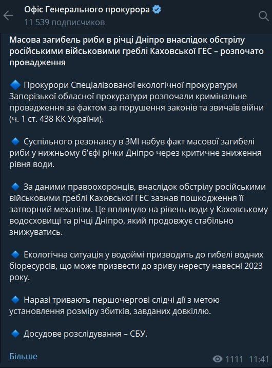 Также в Офисе генпрокурора сообщают, что гибель рыбы может привести к срыву нереста в 2023 году.
