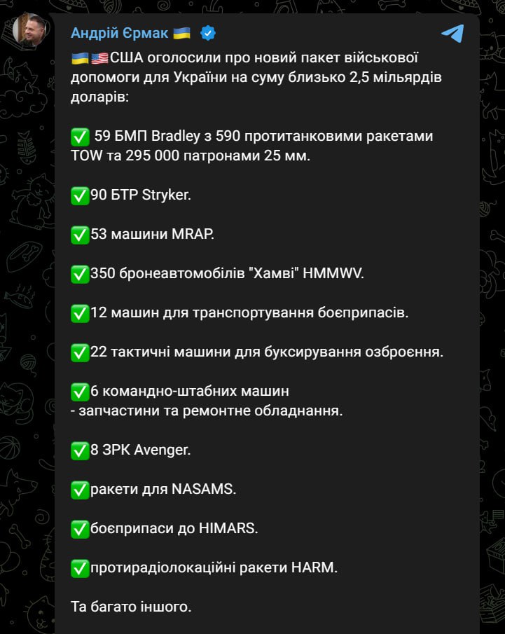 09.30 Глава Офиса президента Ермак опубликовал более детальный список того, что вошло в новый пакет помощи США: