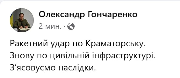 "Ракетный удар по Краматорску. Снова по гражданской инфраструктуре. Устанавливаем последствия", - написал Гончаренко.