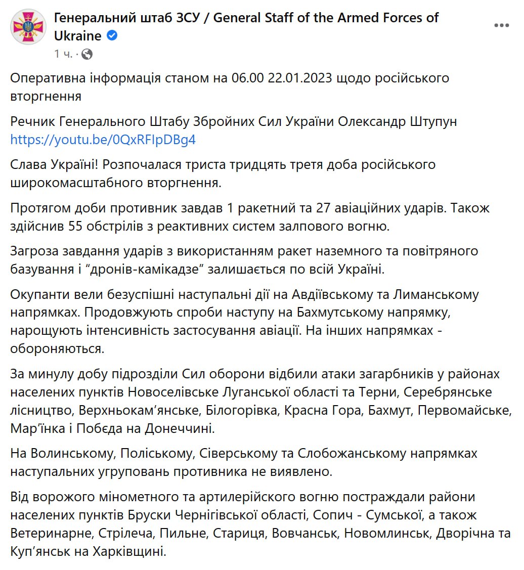 В воскресенье, 22 января, в Украине идет уже 333-й день войны с РФ.