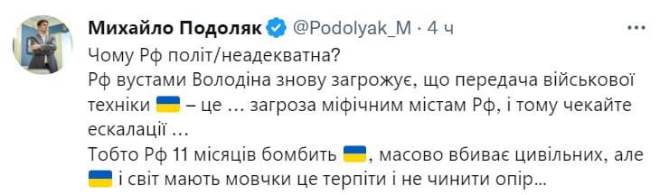 На днях ряд российских деятелей, среди которых Дмитрий Медведев и патриарх Кирилл, также поднимали эту тему. Они заявляли, что западные поставки бронетехники и призывы добиться военного поражения России, могут вызвать третью мировую войну с применением ядерного оружия.