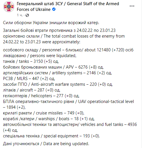 - личного состава ‒ около 121 480 (+720) человек ликвидировано,