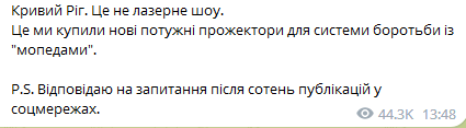 "Кривой Рог. Это не лазерное представление. Это мы купили новые мощные прожекторы для системы борьбы с "мопедами". P.S. Отвечаю на вопросы после сотен публикаций в соцсетях", - пояснил Вилкул.