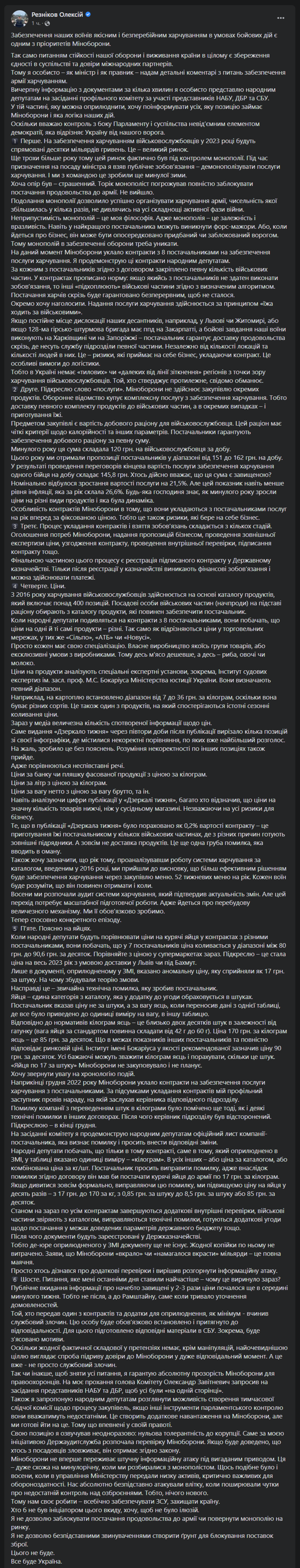 Министр обороны Алексей Резников объяснил завышенные цены на продукты питания для ВСУ, по поводу чего сейчас идет большой скандал, "технической ошибкой".