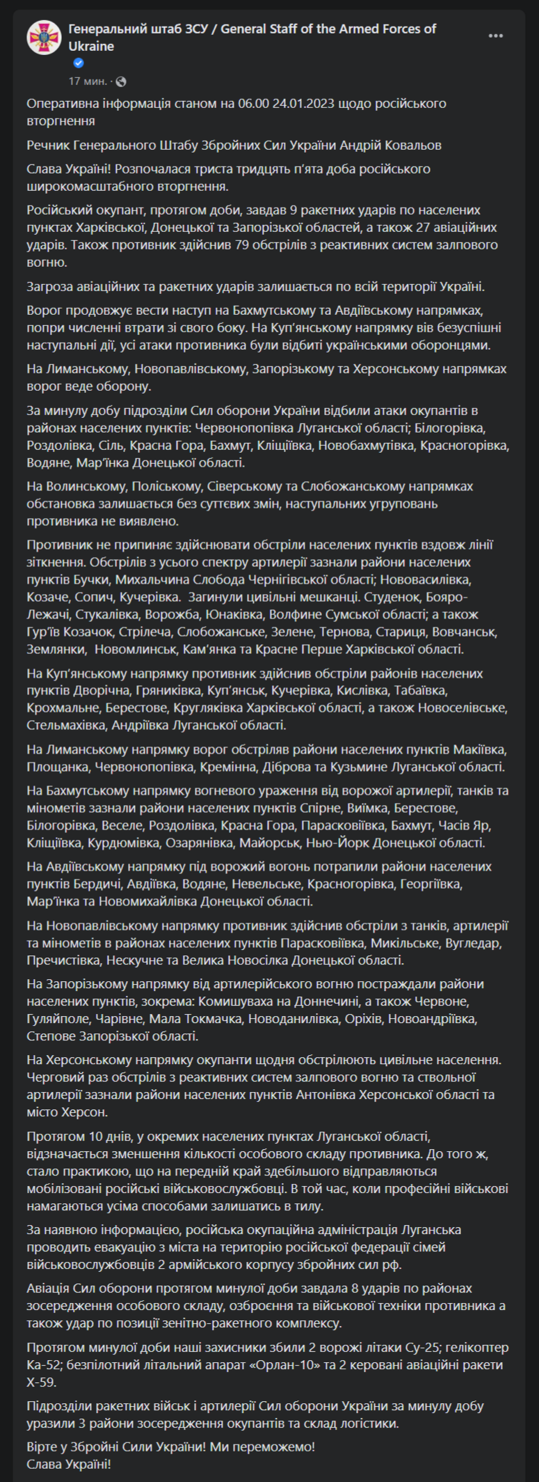 07:48 Главное из сводки украинского Генштаба на утро 24 января: