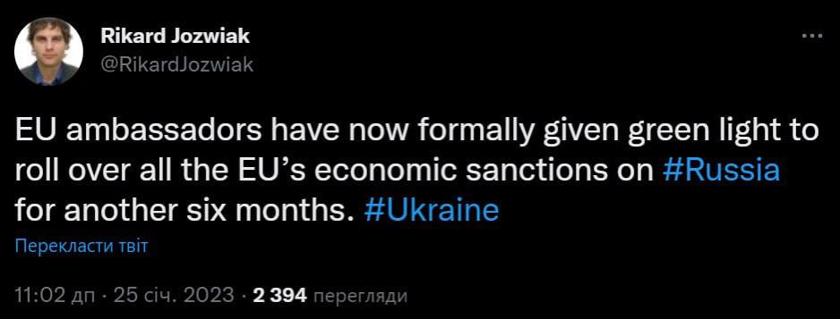 "Послы ЕС официально дали "зеленый свет" для продолжения всех экономических санкций Евросоюза против России еще на шесть месяцев", - написал журналист.