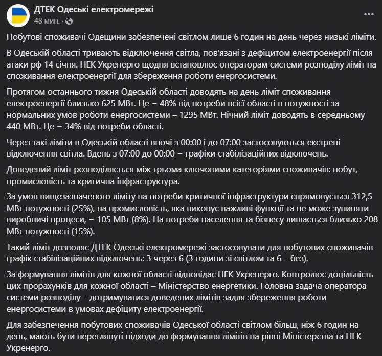 В компании поясняют, что при существующих графиках на нужды населения и бизнеса остается 15% мощностей (для критической инфраструктуры - 25% мощности, на промышленность – 8% из 48% потребностей, которые покрываются лимитами). Поэтому в Одесской области графики почасовых отключений света работают по принципу "3 через 6" (три часа со светом и шесть – без).
