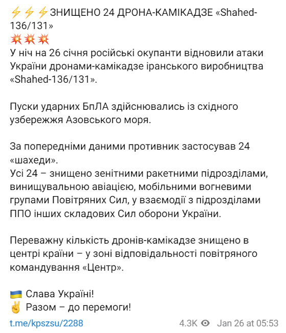 В ночь с 25 на 26 января россияне выпустили по Украине 24 иранских дрона-камикадзе, все они были сбиты Вооруженными силами Украины.