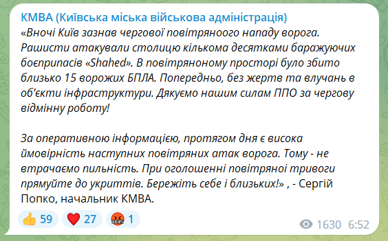 "При объявлении воздушной тревоги направляйтесь в укрытия. Берегите себя и близких", -  заявил Сергей Попко.