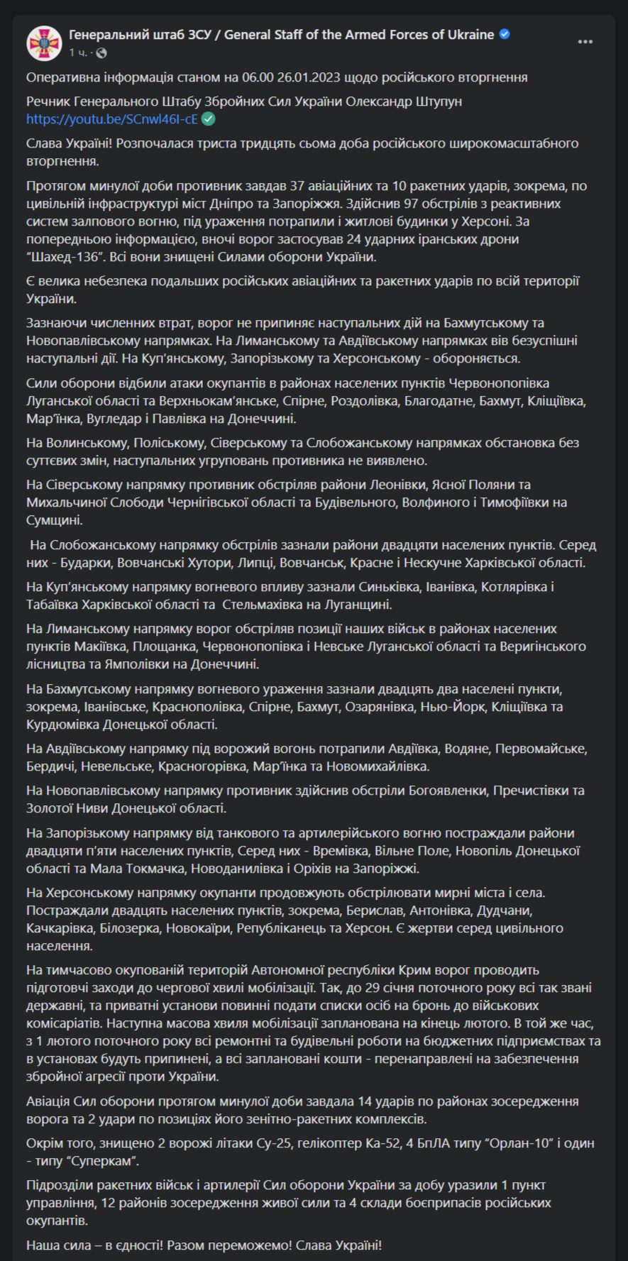 Война в Украине продолжается уже 337-й день. Мы следим за новостями 26 января в своем онлайне.