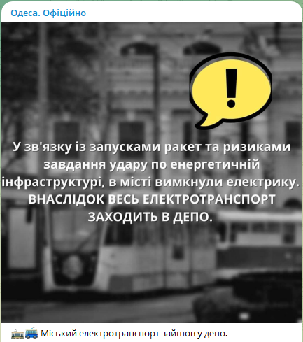 В Одессе по всему городу выключили электричество, поэтому весь электротранспорт также заходит в депо.