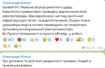 "Энергетики превентивно производят отключение линий электропередач, уже отключена часть критической инфраструктуры тепло- и водоснабжения... Останавливается коммунальный электротранспорт", - написал он.