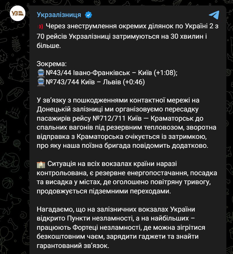 "Укрзализныця" сообщает, что ситуация на всех вокзалах страны контролируемая, есть резервное энергоснабжение.
