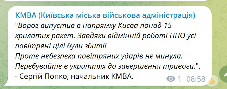Утром в четверг, 26 января, во время воздушной тревоги, в направлении Киева было выпущено более 15 крылатых ракет, все они были сбиты.