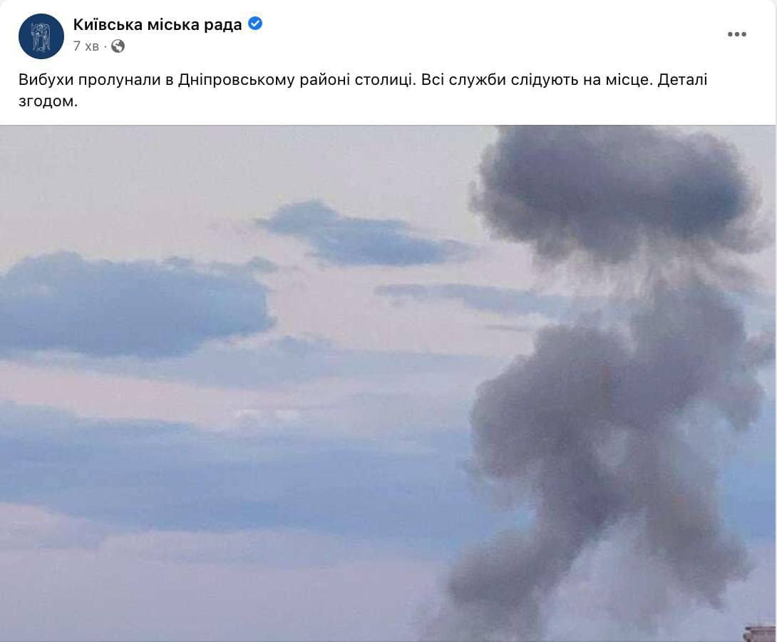 Также Киевский горсовет публикует фото задымления на месте взрыва в Днепровском районе столицы. Сообщается, что все службы следуют на место. Детали сообщат скоро.