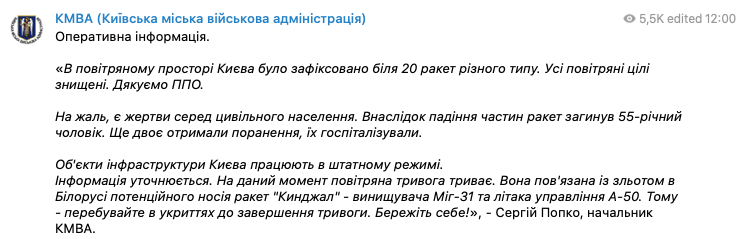 Также столичные власти подтверждают информацию, что воздушная тревога продолжалась из-за взлета в Беларуси потенциального носителя ракет "Кинжал" - истребителя Миг-31 и самолета управления А-50.