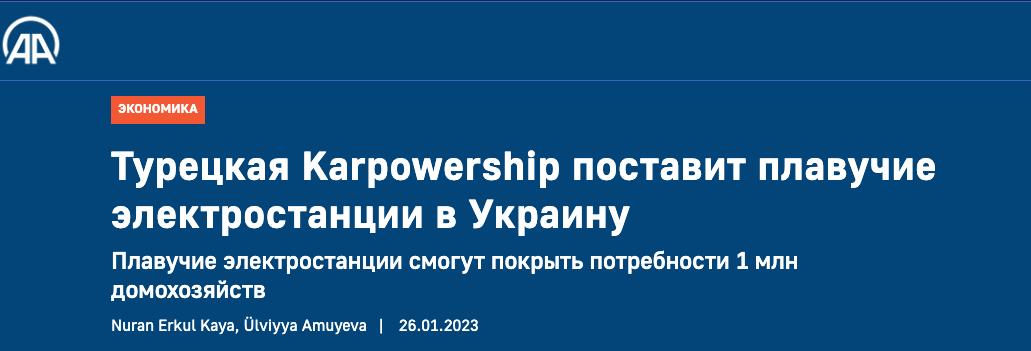 "Плавучие электростанции предлагают быстрые, надежные и гибкие решения проблем с электричеством, и мы готовы поддержать Украину в этом как можно скорее", - заявила представитель компании Karpowership Зейнеп Харези.