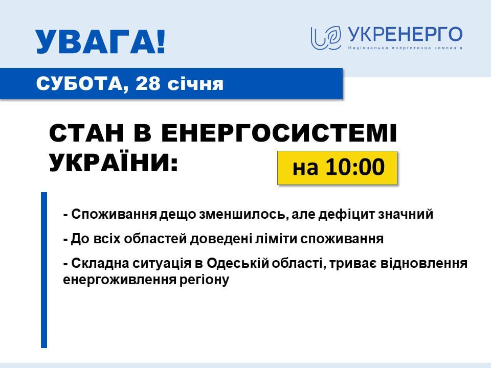 Причина дефицита - повреждение электростанций и высоковольтной сети в результате российских ракетных и дроновых атак 26 января. При этом, энергосистема все еще восстанавливается после предыдущих серий вражеских ракетных обстрелов, повлекших повреждение энергоблоков электростанций. В результате, производство электроэнергии на работающих электростанциях не может полностью покрыть потребление.
