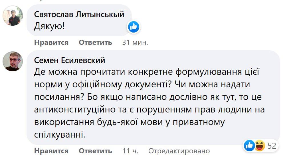 В то же время киевский ученый и блогер Семен Есилевский считает, что запрет частных разговоров на русском является нарушением Конституции: "это антиконституционно и является нарушением прав человека на использование любого языка в частном общении".