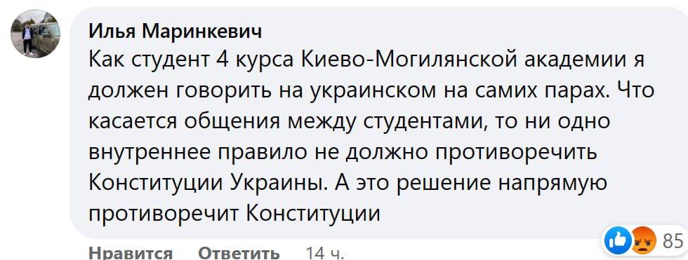 "Как студент 4 курса Киево-Могилянской академии я должен говорить на украинском на самих парах. Что касается общения между студентами, то ни одно внутреннее правило не должно противоречить Конституции Украины. А это решение напрямую противоречит Конституции", - заявил он.