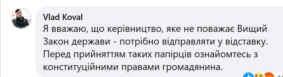 "Я считаю, что руководство, не уважающее Высший Закон государства – нужно отправлять в отставку. Перед принятием таких бумажек ознакомьтесь с конституционными правами гражданина", - пишет киевлянин Влад Коваль.