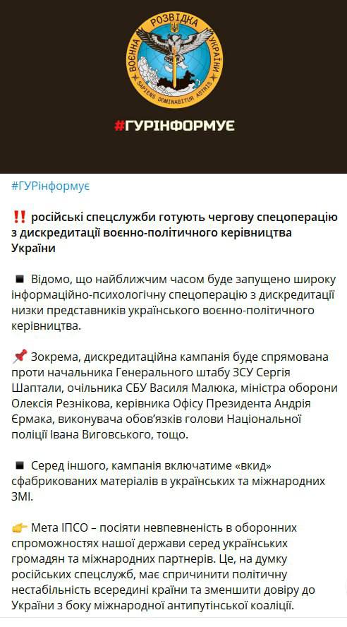 В частности, отмечает ГУР, дискредитационная кампания будет направлена ​​против начальника Генштаба Сергея Шапталы, и.о. главы СБУ Василия Малюка, министра обороны Алексея Резникова, руководителя Офиса президента Андрея Ермака, исполняющего обязанности главы Национальной полиции Ивана Выговского и некоторых других.