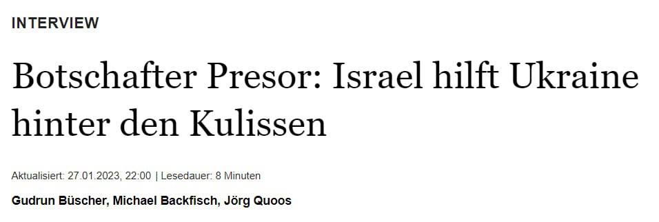 12.18 Закулисно Израиль поддерживает Украину в войне против России гораздо более широко, чем открыто говорится. Такое заявление сделал новый посол Израиля в Германии Рон Просор в интервью Funke Mediengruppe.