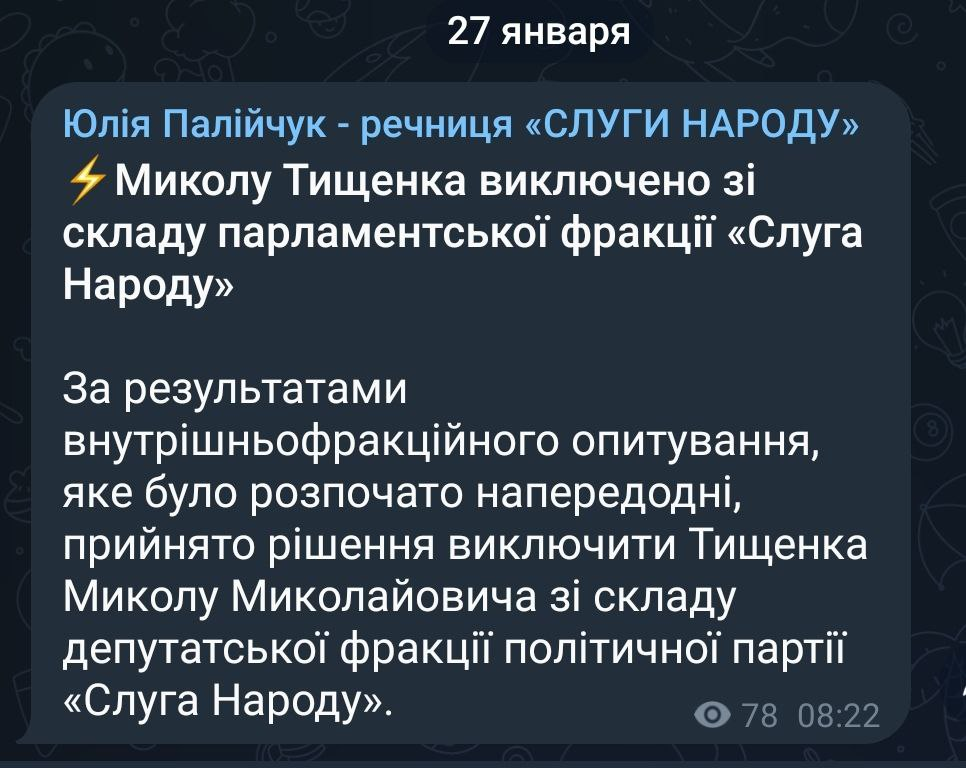 "По результатам внутрифракционного опроса, начатого накануне, принято решение исключить Тищенко Николая Николаевича из состава депутатской фракции политической партии "Слуга Народа"", - написала Палийчук.