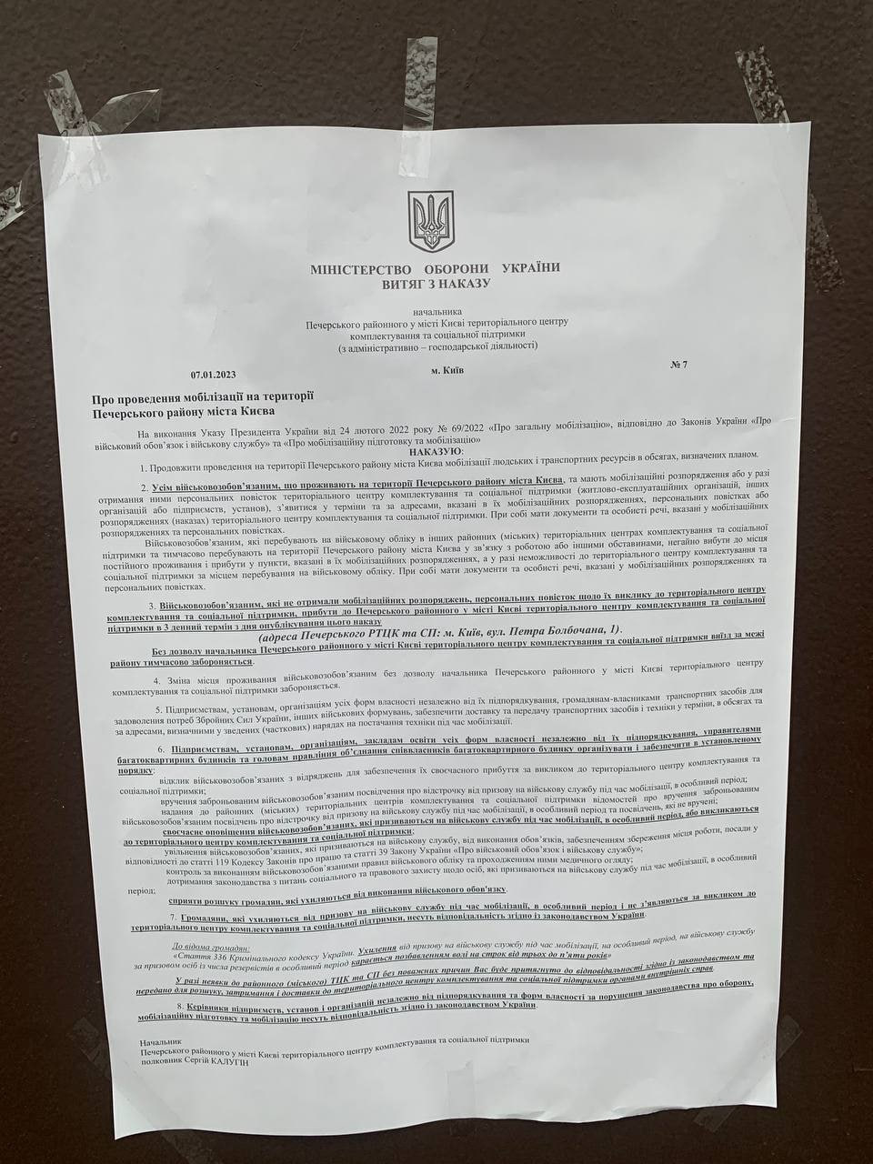Также в столице продолжают расклеивать на подъездах объявления с призывом ко всем явиться в военкомат без повестки в трехдневный срок. Такие приказы появились уже и в центральном Печерском районе Киева.